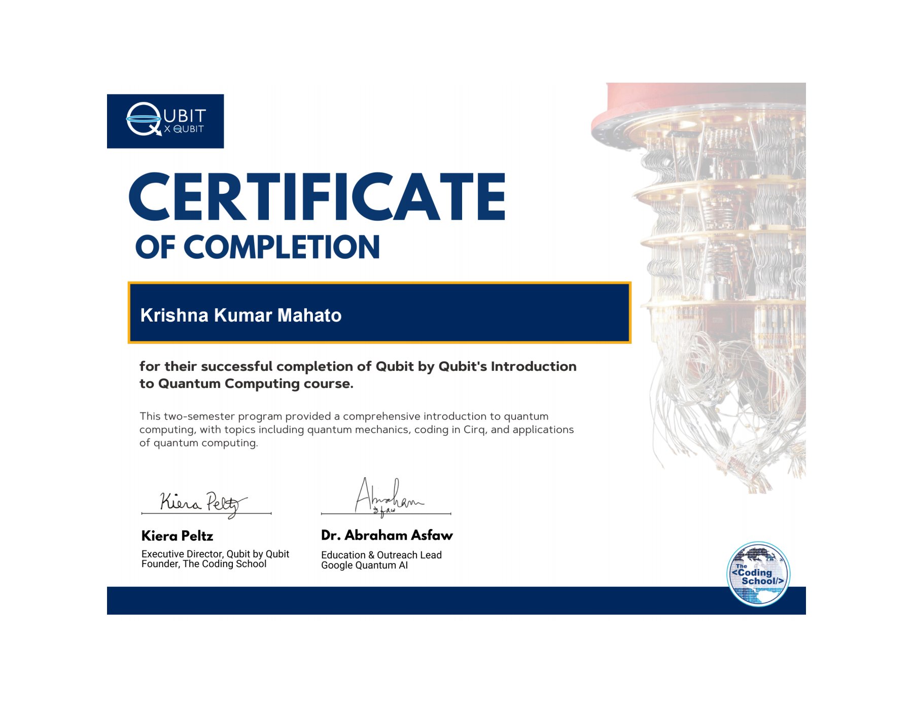 Achieved a groundbreaking Quantum Computing certification from Coding School, unlocking the future of technology, innovation, and limitless possibilities!